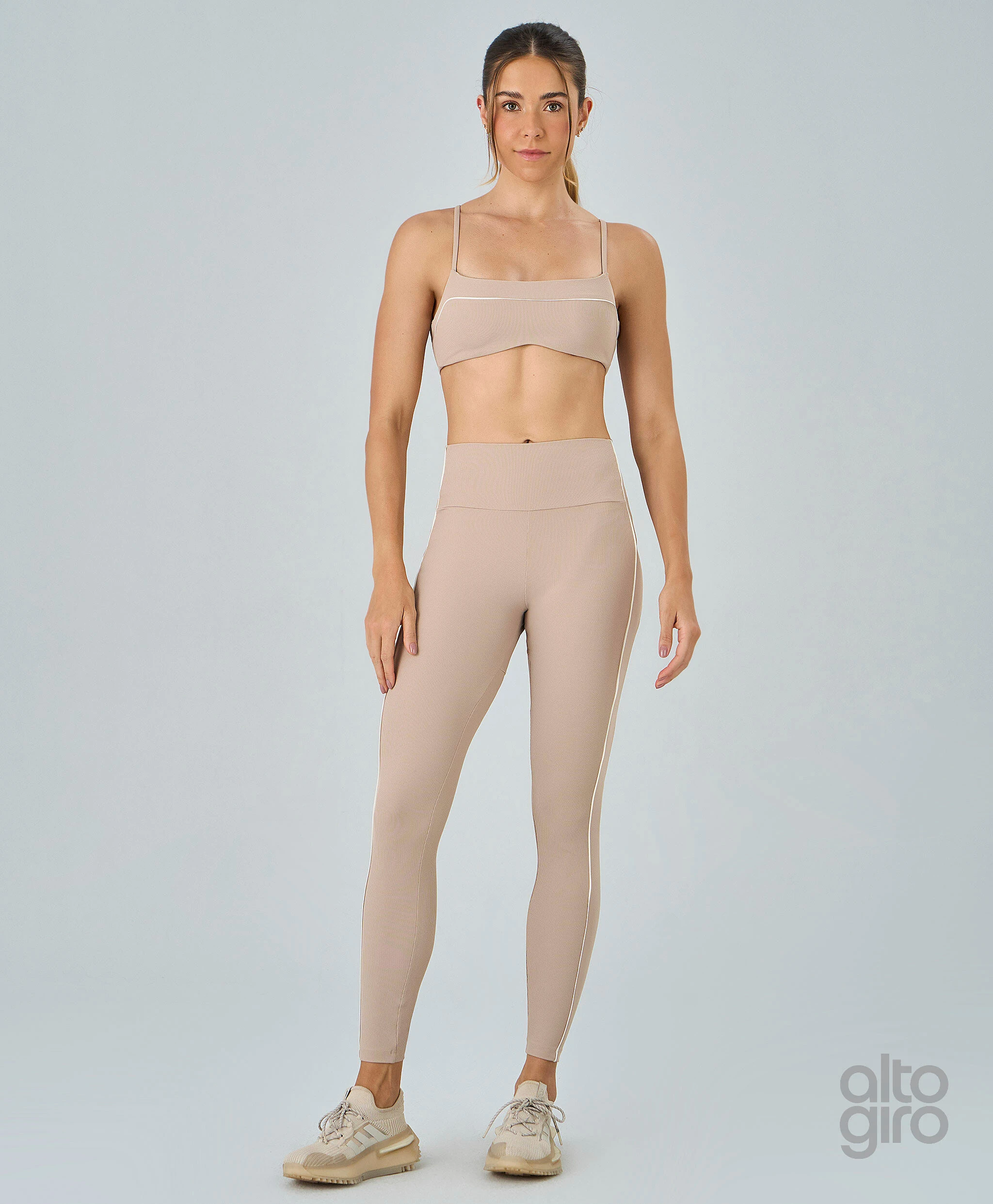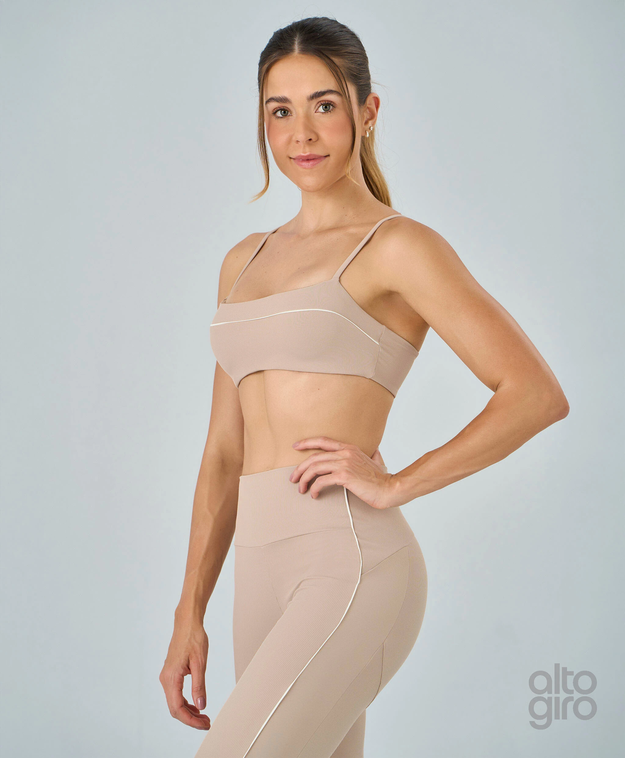 Top Rib com Friso confeccionado em malha canelada de poliamida, com excelente elasticidade e toque macio, oferecendo conforto e sustentação. Modelo com alças finas, friso frontal em contraste e elástico embutido no cós para ajuste seguro. Bojo removível e personalização Alto Giro nas costas completam o visual moderno da peça.