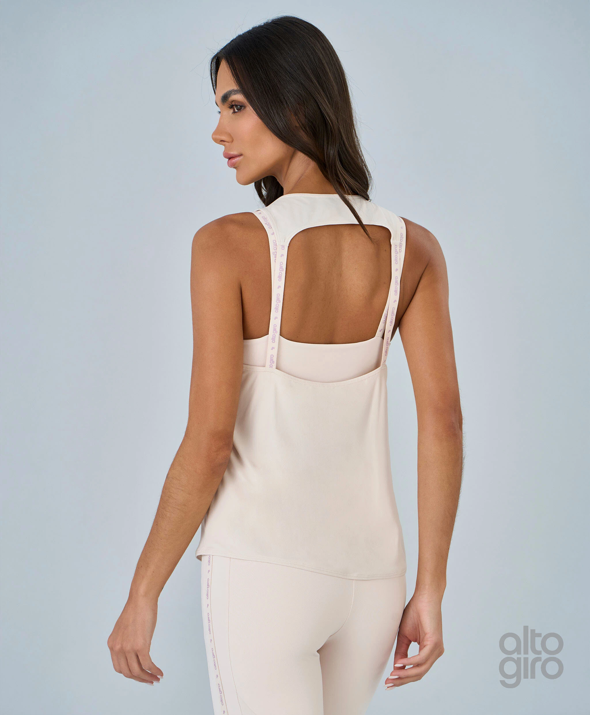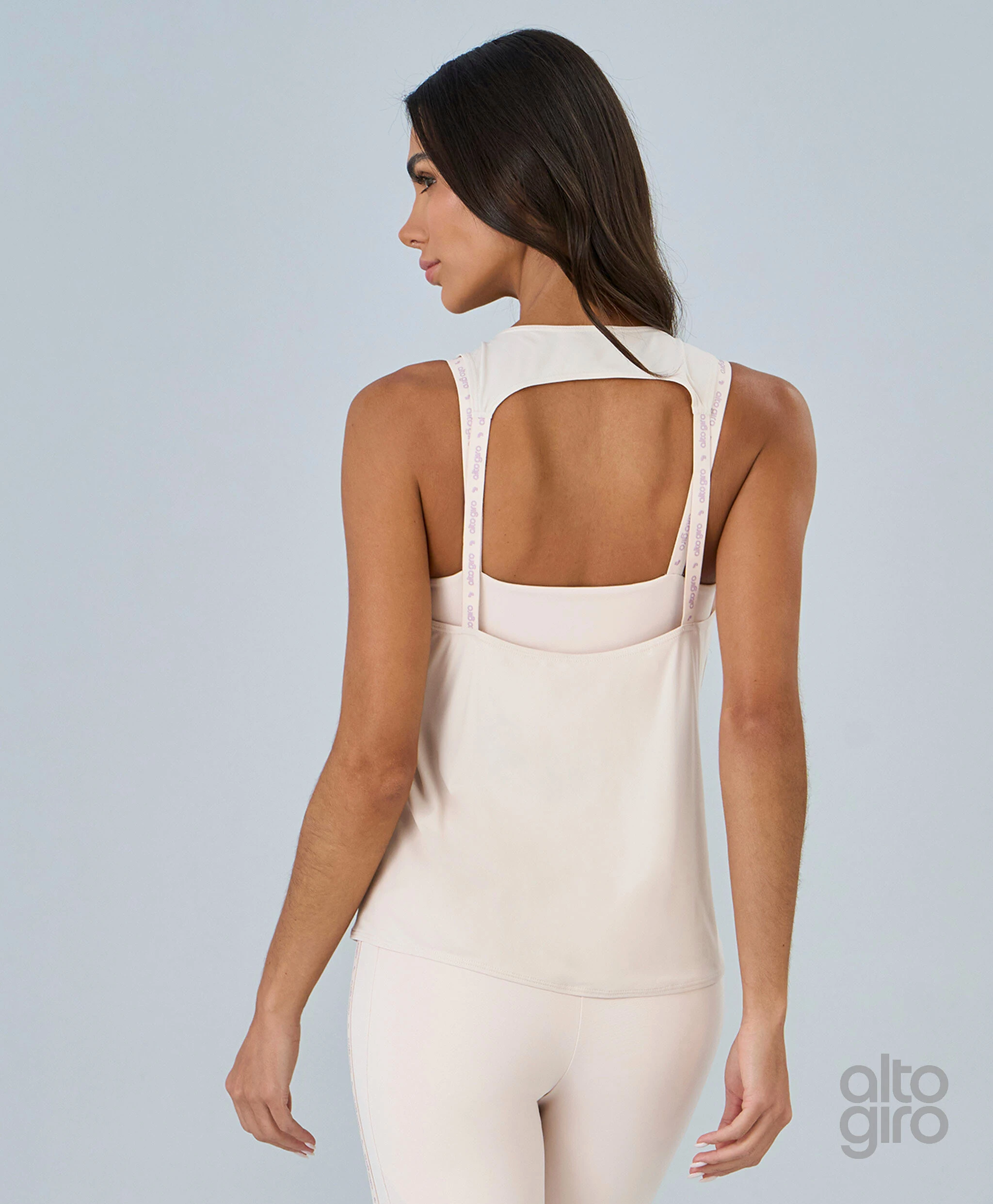 Regata Costas Elástico Personalizado em poliamida de toque macio com proteção UV e tecnologia easy care, garantindo conforto e praticidade. Modelo de shape solto, decote redondo e comprimento regular. Detalhe de elástico personalizado e refletivo adiciona estilo e identidade à peça.